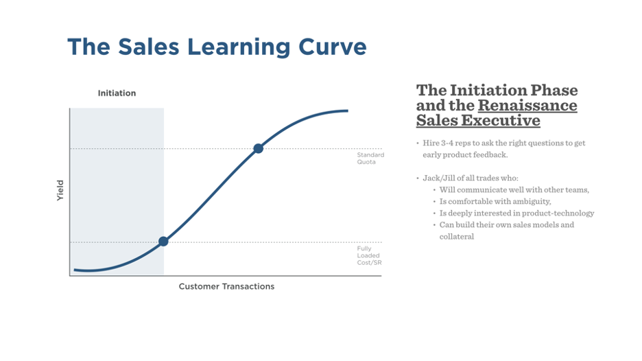 The Sales Learning Curve informs us of the initial staffing strategy for sales. Select three or four initial sales reps who will enhance corporate learning—the Renaissance Sales Rep or the Jack or Jill of all trades who can relate to product management, marketing and engineering teams as effectively as to the customer. It’s a good idea at this juncture to control costs and set investor expectations down to realistic levels.